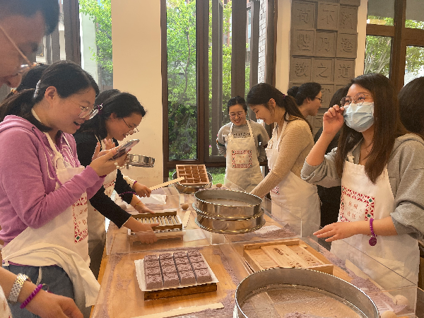 工作人员首先介绍了叶榭软糕的历史、传承和品牌创新,然后详细讲解了制作步骤、工具使用方法以及软糕脱模成型的注意事项,接下来老师们将倒入筛子的米粉筛入模具中,平整米粉,用木蛋压出凹陷用以填充馅料,小心倒入流质豆沙,再筛入米粉覆盖,铺上油纸,压上并敲击木板,翻转模具后脱模,印着吉祥祝福和卡通图案的软糕就在老师们此起彼伏的笑语声中诞生了。软糕制作步骤看似简单,但要出品糕体完整、不漏馅料的软糕,实则需要关注细节、积累经验。