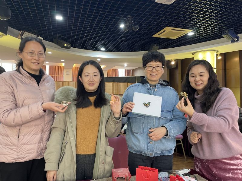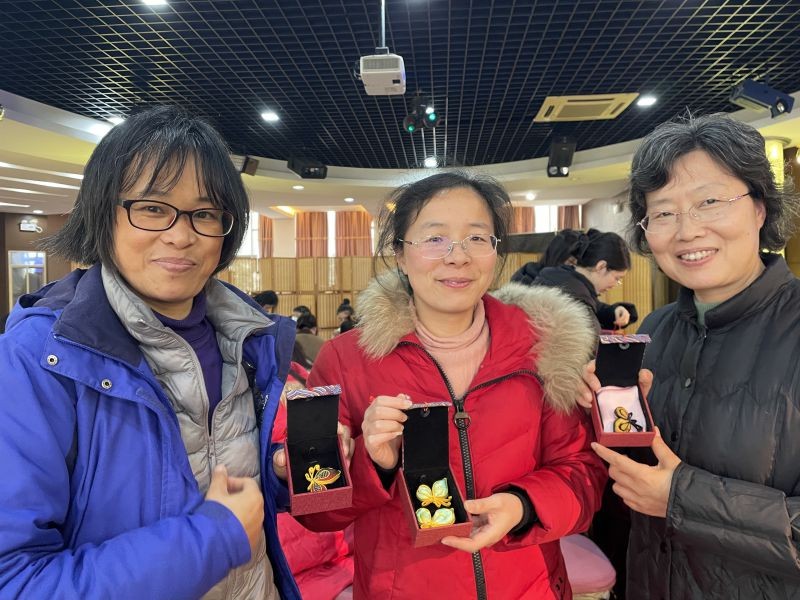 女教师们在老师的精心指导下开始制作盘扣蝴蝶胸针,大家先用袢条盘绕蝴蝶造型,再缝线定型,在黏贴的真丝面料里填充棉花,缝上装饰珍珠,最后在底布贴上胸针配件。每一道工序看似简单,实则特别需要细腻、耐心和专注。慢工出细活,当一枚枚五彩斑斓的盘扣蝴蝶渐渐成型,大家彼此欣赏时,美的愉悦油然而生,现场洋溢着一片欢声笑语和满满的成就感。