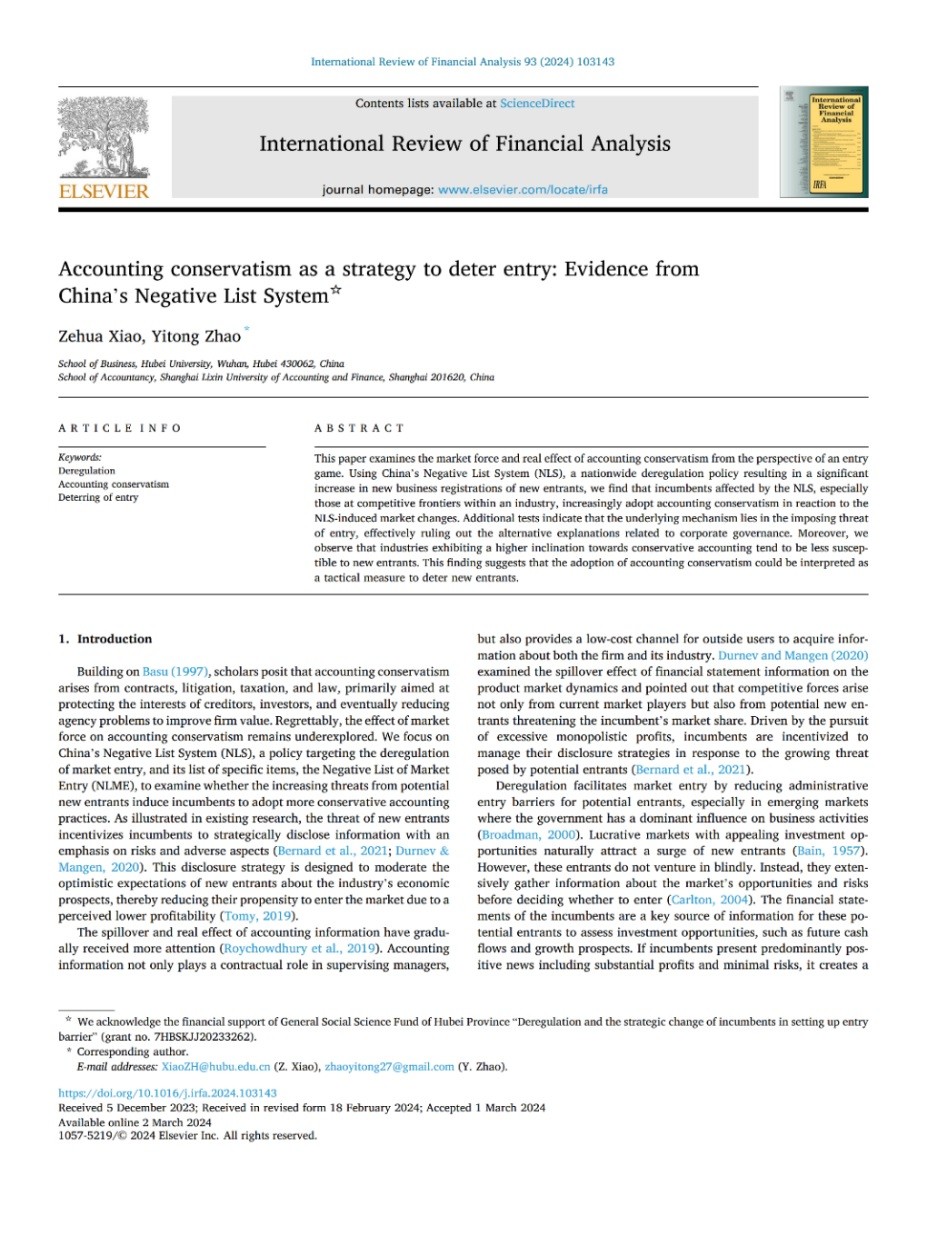 我院教师赵祎曈以通讯作者身份与其合作者撰写的文章“Accounting conservatism as a strategy to deter entry: Evidence from China’s Negative List System”被期刊International Review of Financial Analysis接受并正式发表。International Review of Financial Analysis是SSCI JCR一区和ABS三星期刊,影响因子为8.2。
