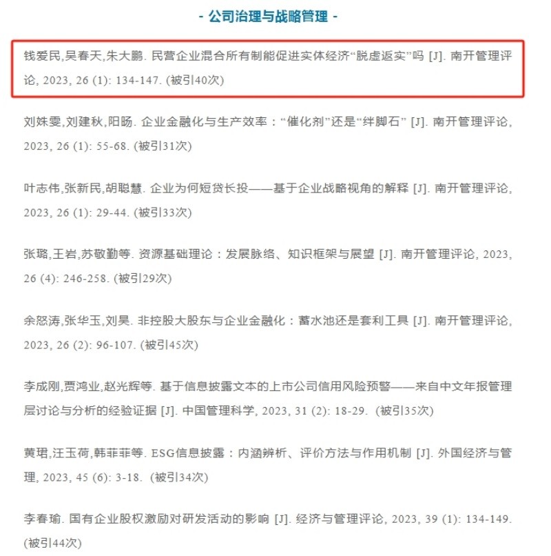 我院教师朱大鹏与其合作者撰写的文章“民营企业混合所有制能促进实体经济‘脱虚返实’吗”被期刊《南开管理评论》接受并正式发表,同时入选2023年管理学C刊高被引论文TOP50。