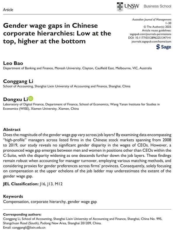 文章探讨性别薪酬差距在企业内部不同职位等级中的异质性,利用2008至2019年中国A股上市公司“高管层”数据,系统考察CEO、其他C-Suite成员及监事间的性别工资差异。结果显示,虽然男女CEO的薪酬无显著差异,但在C-Suite和监事层级,女性薪酬显著低于男性,且差距随职位层级降低而扩大。此外,我们以出生性别比代理地区性别偏好,发现地方文化偏好并不能解释层级性别薪酬差异。本文从企业内部层级角度拓展了对性别薪酬差距形成机制的理解,提示聚焦高层职位可能低估整体性别不平等的严重程度。研究强调,应将组织内部不同职位群体纳入性别平等政策设计之中,以实现更具针对性的治理与改进。