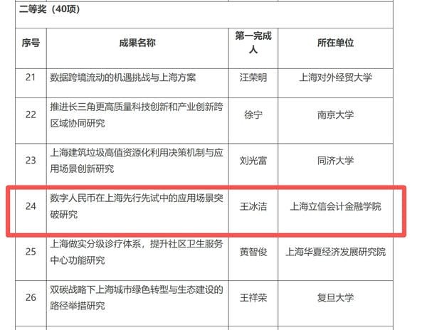 近日,上海市政府组织开展了第十五届上海市决策咨询研究成果奖评选工作。经严格评选程序,共有80项成果获第十五届上海市决策咨询研究成果奖。tcy8722太阳集团王冰洁老师的研究成果《数字人民币在上海先行先试中的应用场景突破研究》获评二等奖。