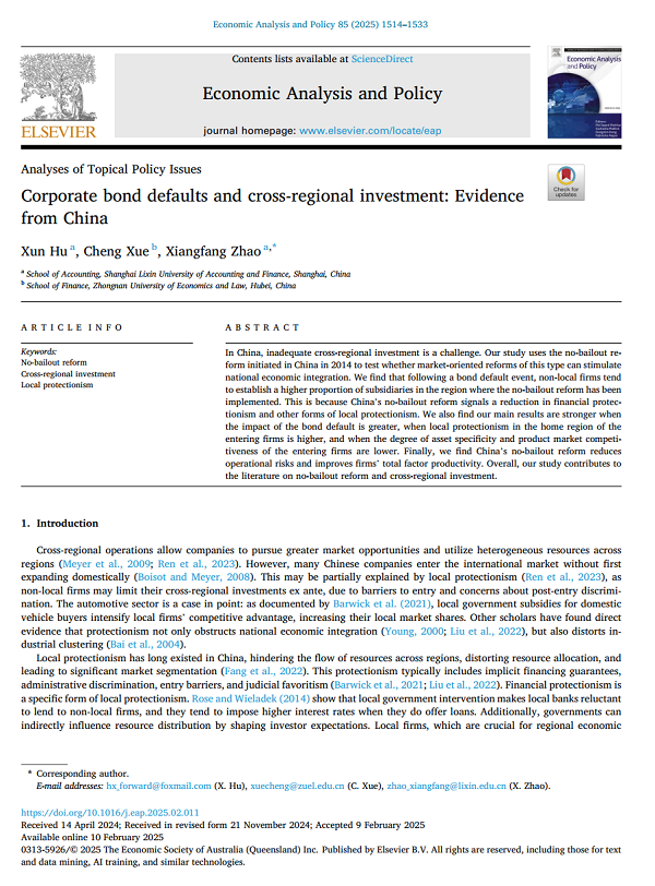 我院教师胡浔老师(第一作者)和赵向芳老师(通讯作者)与合作者撰写的论文“Corporate bond defaults and cross-regional investment: Evidence from China”被期刊Economic Analysis and Policy正式接收并发表。Economic Analysis and Policy是SSCI JCR一区期刊,最新影响因子7.9。