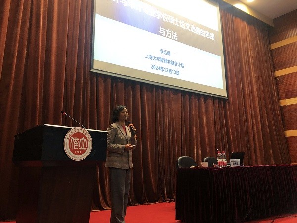随后,李远勤教授向同学们深入阐释了会计与审计研究选题的核心要素,主张选题应“小而实”,即问题要小、论证要实。她认为,学位论文的选题要回应现实关切、坚持问题导向,兼具新颖性和时效性,发现新领域新问题,获得新发现新结论;同时应综合考虑选题的针对性、可行性以及个人学术能力的边界,力求以小见大,量力而行。李远勤教授分别从“具体”“有趣”“新颖”“可行”四个维度介绍了优秀选题的特质,认为选题的核心要素在于“新”,应着眼于当下最新政策、行业最新动态、企业最新事项,或者企业遇到的特殊困难,并列举了近几年获得全国会计硕士专业学位优秀学位论文的论文清单,生动地展示了什么是好的选题,特别强调同学们在研究过程中应积极主动地与导师进行交流,以确保研究方向的正确性和研究深度的充分性。