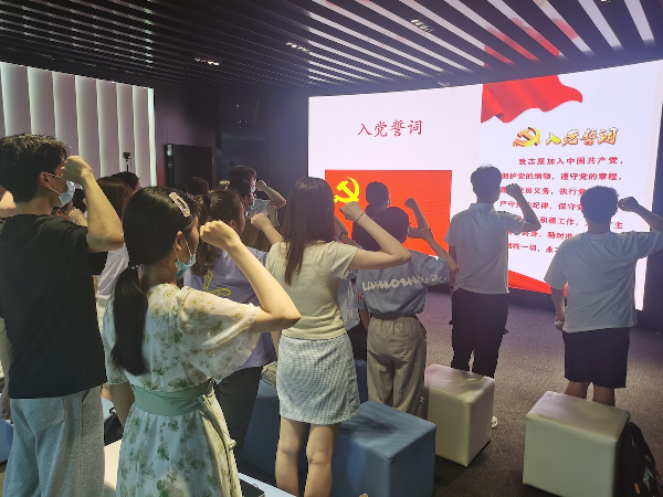 全体党员实地参观了海尔卡奥斯工业智能研究展厅,聆听了卡奥斯工业互联网平台产品及解决方案的相关情况介绍,深入了解工业互联网的产生发展、实现路径、未来趋势等内容,重点体验了智慧党建功能区的“融课堂”。“融课堂”运用高科技赋能党建,以AI/VR/AR等信息技术为手段,以新时代的语境表达党建内容,营造严肃、活泼的学习氛围,借助互动观影椅、悦骑等设备,使学生党员其身临其境地体会伟大历程。体验结束后,宣讲团作“入党誓词沿革历史”的主题宣讲,学生第一、第二党支部本学期新发展的党员在智慧党建体验馆开展入党宣誓,由第二党支部书记杨晓萌领誓。