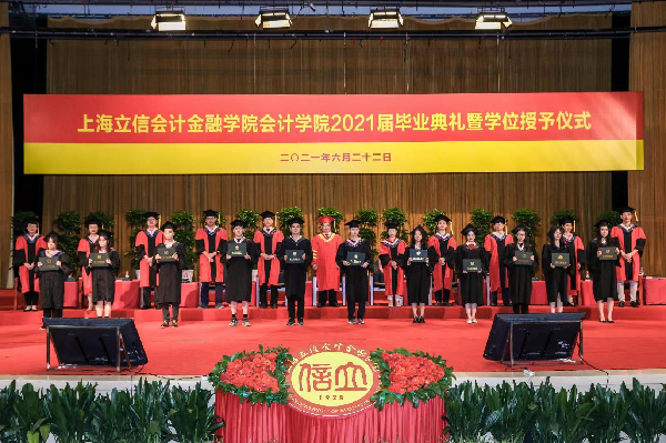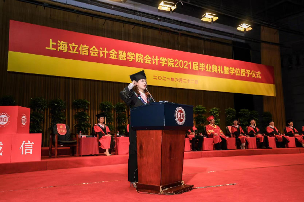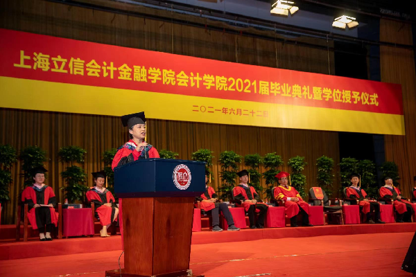 毕业生代表刘旺用“难忘”,“感激”和“再见”总结了自己的大学生涯。他表示,作为一名退伍大学生,在别离校园之际,更应坚定的将“在立信之所学”积极投入社会主义建设中,勇担青年之责任。