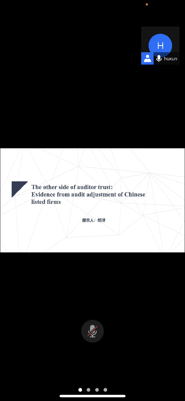 在一个小时的讲座中,胡浔分享了最新的工作论文《审计师信任与审计调整》。该论文研究审计师信任与审计调整之间的关系。在控制了公司固定效应与审计师固定效应的情况下,研究发现审计师对公司的信任与审计调整显著正向关,并且主要表现为更可能进行向下的审计调整。其次,研究发现审计师信任对审计调整的影响在企业风险较高时更显著。进一步的检验发现,审计师对公司的信任对操纵性应计的绝对值有显著正向的影响,但是对操纵性应计的实际值有显著负向的影响;审计师信任对审计收费也有显著负向的影响。最后研究发现审计师的信任提高了公司盈余公告的盈余反应系数。研究认为对于风险导向型审计,审计师的信任提高了审计师风险判断的效率,从而提升了审计师审计调整意愿。研究为信任对资本市场参与者影响的相关研究提供了一个新的视角。