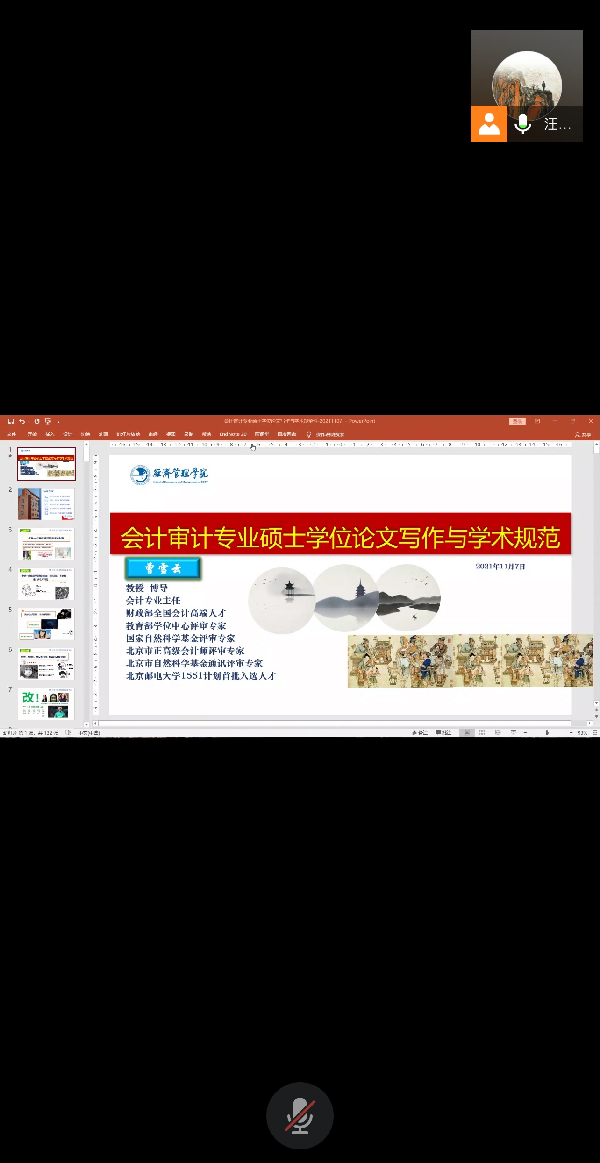 2021年11月7日上午,tcy8722太阳集团在腾讯会议平台举办“会计审计专业硕士学位论文写作与学术规范性”学术讲座,讲座由北京邮电大学经济管理学院教授曾雪云主讲。讲座由汪猛老师主持,专业教师和学生共126人参加。