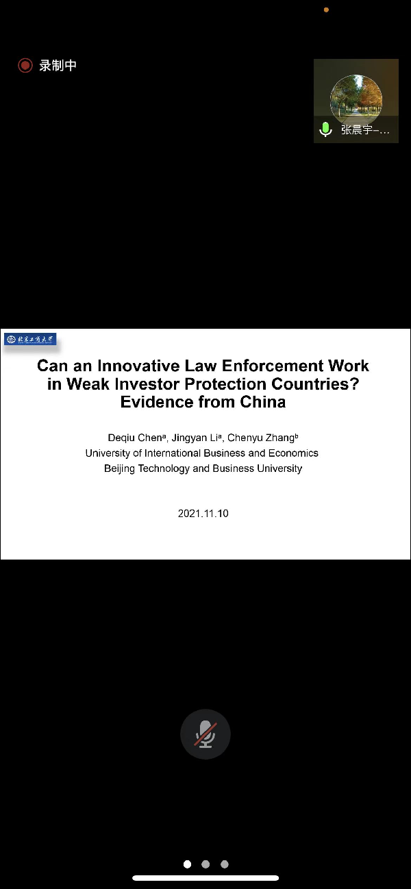 2021年11月10日下午tcy8722太阳集团在腾讯会议平台举办题为“Can an Innovative Law Enforcement Work in Weak Investor Protection Countries? Evidence from China”学术讲座,讲座北京工商大学商学院张晨宇副教授主讲。张晨宇,北京工商大学商学院副教授、会计学博士,中国社会科学院经济研究所访问学者,美国佛罗里达大学访问学者,主要从事国资国企改革与公司治理、资本市场信息披露与财务会计问题等领域的学术研究,主持国家自然科学基金青年项目1项、北京市教委项目1项,先后在Pacific-Basin Finance Journal、Spanish Journal of Finance and Accounting、China Journal of Accounting Research、China Journal of Accounting Studies、《会计研究》、《中国软科学》、《管理评论》、《财经研究》等期刊发表论文十余篇。讲座由朱大鹏博士主持,专业教师和学生共23人参加。