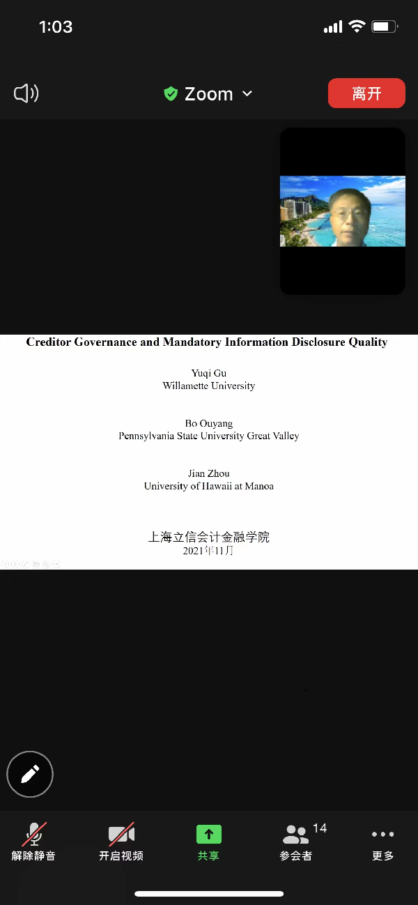 2021年11月24日下午tcy8722太阳集团在ZOOM会议平台举办题为“Creditor Governance and Mandatory Information Disclosure Quality”学术讲座,讲座由美国University of Hawaii at Manoa周建教授主讲。周建,美国University of Hawaii at Manoa教授、博士生导师,研究领域为审计、公司金融,《The Accounting Review》、《Auditing: A Journal of Practice and Theory》编委会委员。在Contemporary Accounting Research、Journal of Accounting and Economics、Management Science发表论文30余篇,曾获美国会计学会审计部杰出服务奖。讲座由万华林教授主持,专业教师和学生共20人参加。