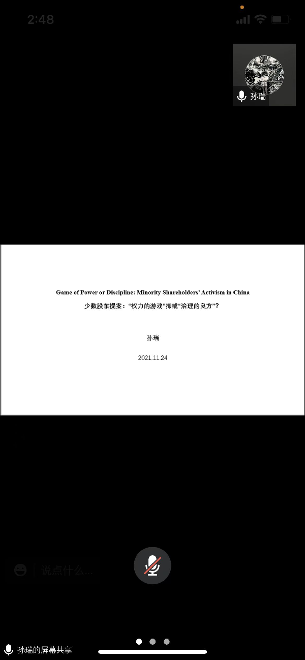 在近一个半小时的讲座中,孙瑞分享了最新的工作论文《Game of Power or Discipline: Minority Shareholders’ Activism in China》。2005年中国《公司法》修订以来,满足条件的少数股东可以直接向公司股东大会提出法定范围内的提案而不受到董事会的制约,中小股东的权益得到法律保障。该研究旨在考察少数股东提出提案的行为对公司是否能起到治理作用。研究发现公司治理状况对少数股东提出提案的行为影响有限,而公司股东结构,特别是少数股东相对于控股股东的持股量对少数股东是否会提出提案具有决定作用。经营业绩差的公司确实更容易被少数股东提出提案,但也仅在相对持股足够大时才能体现出影响,且业绩影响并不具有稳定的规律。相对持股对提出提案行为的影响是规律、显著、稳健的,该变量并没有显著的内生性,但研究结论在控制内生性或可比样本的情况下依然有效。研究发现以多种维度衡量的控股股东权力越大时,少数股东越不倾向于向公司提出提案。此外,研究也发现少数股东提案的价值并非都是积极的,但是投票股东和市场投资者可以识别其价值。虽然样本中大部分少数股东提案在投票过程中都能通过,但首次公告估值效应为负的提案在投票中获得相对较少的支持,而当少数股东提案明确反对管理层时则会得到相对更多的来自其他少数股东的支持。少数股东提案对公司业绩或治理的提振效应依然有限,但高层管理人员被迫离职的概率在提提案当年和下一年显著增加。研究的主要贡献在于从权力对比的角度为股东积极主义的研究提供了全新的视角。