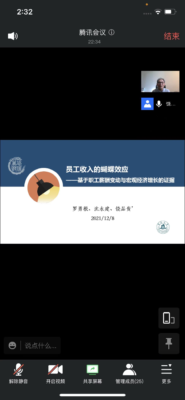 2021年12月8日下午tcy8722太阳集团在腾讯会议平台举办题为“员工收入的蝴蝶效应——基于职工薪酬变动与宏观经济增长的证据”学术讲座,讲座由暨南大学管理学院会计学系主任饶品贵教授主讲,万华林教授主持,专业教师和学生共28人参加。饶品贵,暨南大学管理学院会计学系主任、MPAcc教育中心主任、教授、博士生导师、广东省珠江学者特聘教授,暨南大学学术委员会委员。主要的研究领域是:宏观经济政策与微观企业行为的互动关系、财务会计信息与资本市场、财务报表文本分析,相关的研究成果发表在Review of Accounting Studies、《经济研究》、《管理世界》等国内外顶尖期刊上,主持三项国家自然科学基金面上项目。