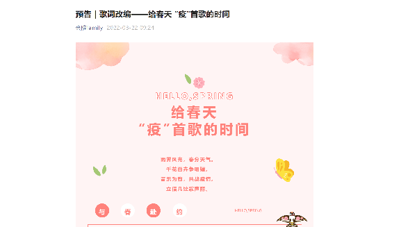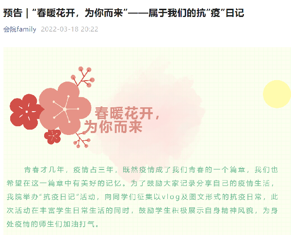 为了丰富和充实学生的线上学习生活,tcy8722太阳集团团委和学生会精心策划了多姿多彩的校园文化活动,活跃战疫生活。团支部抗“疫”风采展,记录下这段携手面对疫情的时光,增强团支部凝聚力;我的抗“疫”日记,记录下特殊时期的独家记忆,丰富同学们日常生活;朗读者,文字有意,声音有情,抗“疫”期间振奋人心;给春天“疫”首歌的时间,号召同学们以音乐为载,共战疫情。别开生面的战疫活动,在丰富校园文化的同时,让同学们自觉讲好身边抗疫故事,在“抗疫”大思政课中感受成长,更加坚定战胜疫情的决心。