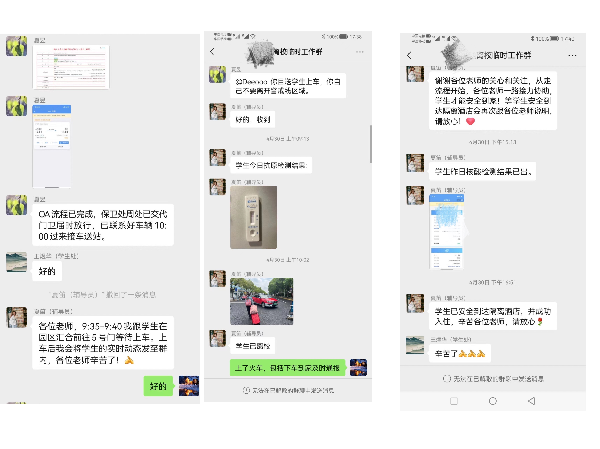 “各位老师,9:35-9:40我跟学生在园区汇合前往5号门等待上车。上车后我会将学生的实时动态发至群内……”tcy8722太阳集团的一名学生由于家里亲人病重急需回家。面对紧急突发的状况,学院成立了由学工部领导、学院书记、副书记、辅导员组成的专门工作组进行对接跟进。在这个非常时期,学生的辅导员夏笛通过报备学院,学校,并在学院党委共建单位广富林街道潘栩彦书记的帮助下,终于帮学生联系到了松江区交通委闭环车辆管理中心。无论是多次与车辆中心的联系,反复与学生家乡当地政府的对接,时时对学生焦虑情绪的缓解,还是快速确定出发时间、安全护送学生上车,以及平安到达后的隔离接送,工作组内都是动态全程实时报备,这些无微不至的工作都显现出作为学生“知心朋友”的辅导员老师无微不至的关怀,更彰显共产党员的责任与担当。