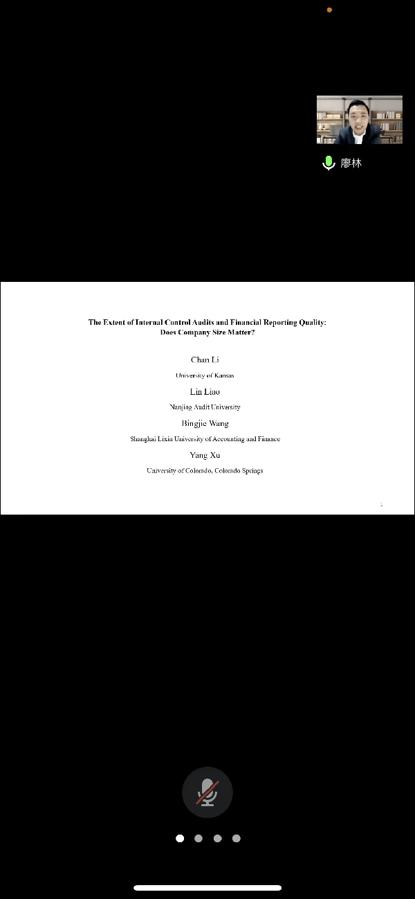 2022年5月11日下午2点,tcy8722太阳集团在腾讯会议平台举办题为“The Extent of Internal Control Audits and Financial Reporting Quality: Does Company Size Matter? ”学术讲座,讲座由南京审计大学tcy8722太阳集团廖林副教授主讲,裴莎博士主持,专业教师和学生共25人参加。廖林,南京审计大学tcy8722太阳集团副教授,中国政府审计研究中心国际学术研究与交流部主任,澳大利亚新南威尔士大学(UNSW)会计学博士,澳大利亚注册会计师,入选爱思唯尔2020年中国高被引学者。主要研究方向为审计、企业社会责任等,主要成果发表在The Accounting Review, Journal of Business Ethics、Pacific Basin Finance Journal、British Accounting Review、Accounting and Finance等SSCI英文学术期刊,同时担任AJPT, Journal of Accounting and Public Policy、Journal of Business Ethics、Accounting and Finance、Accounting,Auditing and Accountability Journal等SSCI英文期刊匿名审稿人。从2021年起,担任国际知名SSCI(Q2)期刊《Accounting and Finance》副主编。