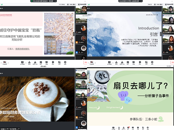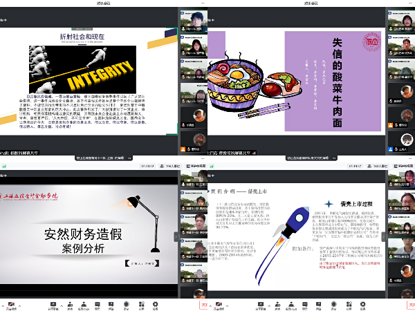 比赛共分为风采展示和案例分析两个环节。风采展示环节,各队伍纷纷带来精彩的才艺表演,给严肃的比赛增添了轻松的氛围。案例分析环节,各参赛队伍在选题上充分融合时事热点,如老坛酸菜、欧莱雅安瓶事件等财经类热点问题。虽然线上形式有一定的局限性,但各队伍仍运用丰富多彩的表现手法,如情景对话、改编歌曲等,深化了与会人员对案例的了解,同时以点即面,展示出了各参赛队伍对诚信的独到见解。选手在展示过程中更是巧妙融入了“信以立志、信以守身、信以处世、信以待人、毋忘立信、当必有成”的校训,各项分析作品引人深思。