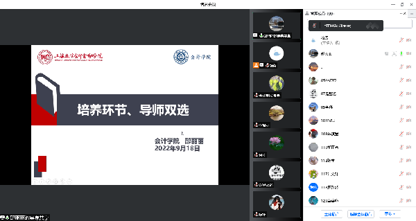 副院长邵丽丽介绍了2022年研究生与导师双向选择原则与具体操作流程,并按照时间节点详细讲解了审计硕士两年学制中各培养环节的时间安排,提醒同学们要牢记研究生学习期间的重要时间节点,鼓励大家积极主动地与导师沟通,提前对培养计划制订、学位论文撰写、创新项目申报等环节进行合理规划。
