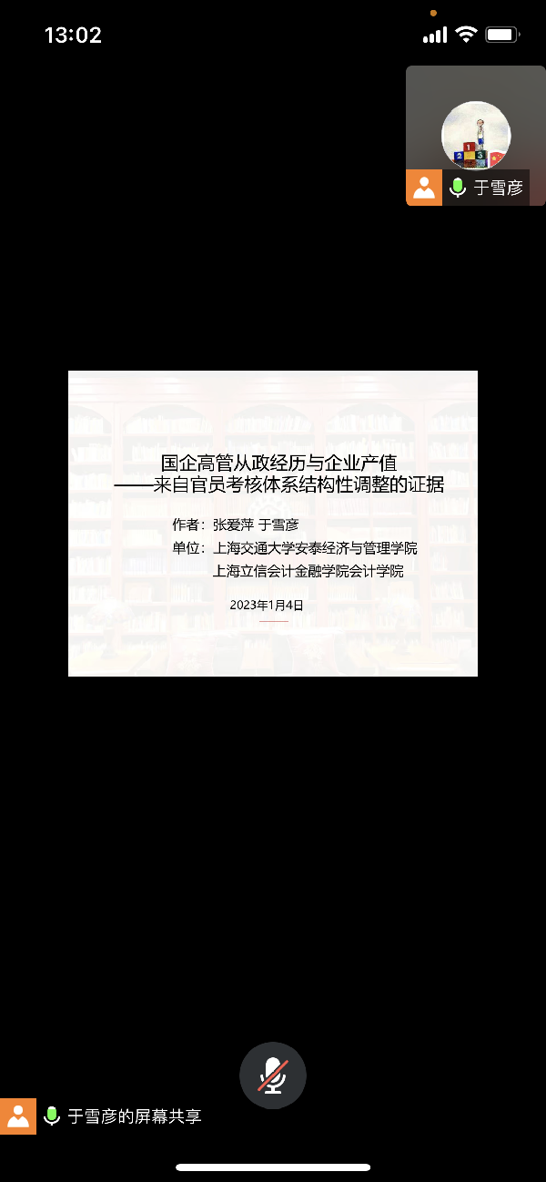 2023年1月4日下午1点,tcy8722太阳集团在腾讯会议平台举办题为“国企高管从政经历与企业产值——来自官员考核体系结构性调整的证据”学术讲座,讲座由tcy8722太阳集团于雪彦博士主讲,邵丽丽副院长主持,11名专业教师参加。