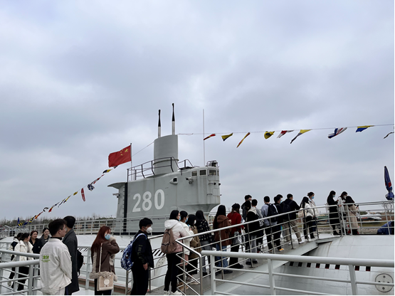 沿着一层出口,同学们参观了“航母”边上的潜水艇,潜水艇是曾服役于海军东海舰队的33型潜艇280艇,使用大量的紫铜、银等贵金属及耐压的特殊材料制造而成。潜水艇入口仅容一人通过,120名师生分4批参观。其内部构造十分精巧,潜艇原本的精密设备全数保留。通过参观,同学们了解了潜水艇复杂的内部构造,也体验了水兵的战斗与生活环境。