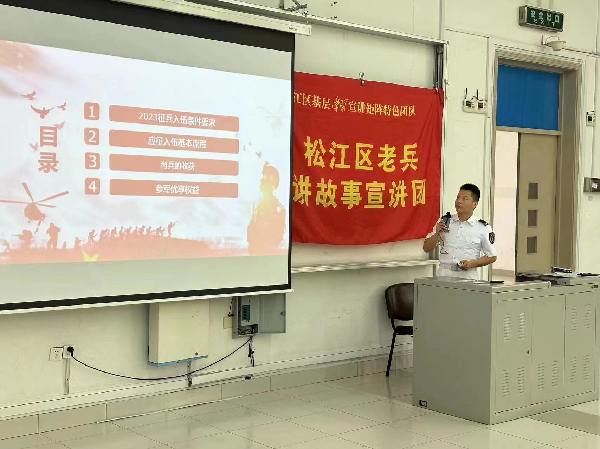 为增强学生群体国防意识与爱国意识,做好征兵政策宣传,推进tcy8722太阳集团2023年大学生应征入伍工作,4月26日,tcy8722太阳集团举办国防教育及征兵宣讲会。“松江区老兵讲故事宣讲团”成员谢鲁淮、朱渭民、李学武出席会议,tcy8722太阳集团部分师生参加此次宣讲会。