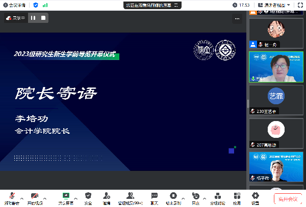 活动开幕式于8月28日下午进行。党委研工部部长、研究生处处长毕玉江,党委研工部副部长、研究生处副处长杨子敬,tcy8722太阳集团党委书记王婧,tcy8722太阳集团院长李培功,tcy8722太阳集团党委副书记、副院长夏昱,tcy8722太阳集团副院长邵丽丽、何芹,审计硕士导师代表,审计硕士教育中心工作人员以及全体2023级审计硕士新生参加开幕式,开幕式由何芹主持。