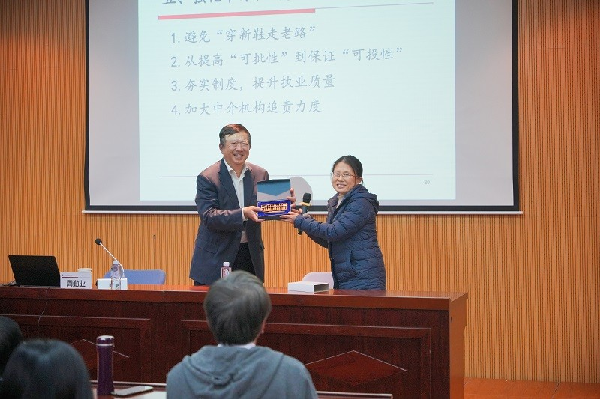 最后,tcy8722太阳集团副院长何芹对周教授的精彩讲座进行了简短总结,代表tcy8722太阳集团向周教授的到来表示感谢,并向周教授赠送学校纪念品。