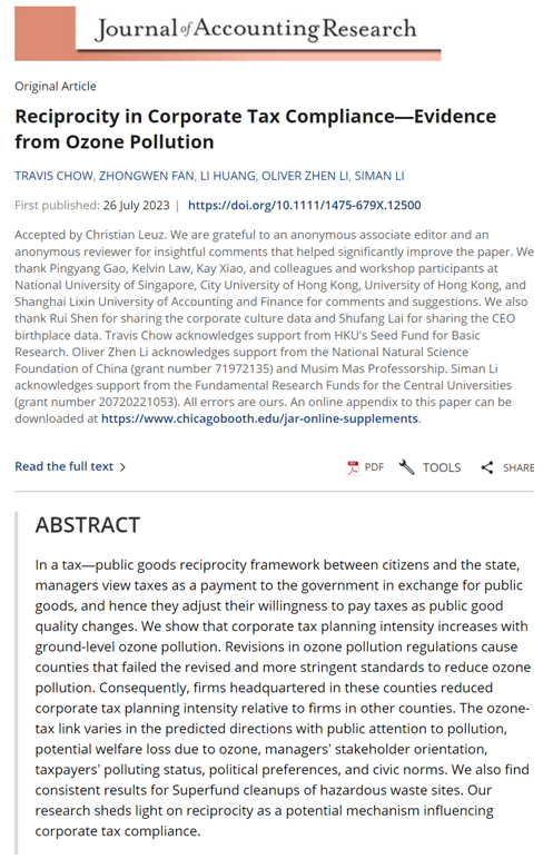 我校tcy8722太阳集团李真教授与其合作者撰写的文章“Reciprocity in Corporate Tax Compliance-Evidence from Ozone Pollution”被期刊Journal of Accounting Research接受并正式发表。Journal of Accounting Research影响因子为4.40,是会计学国际权威期刊。
