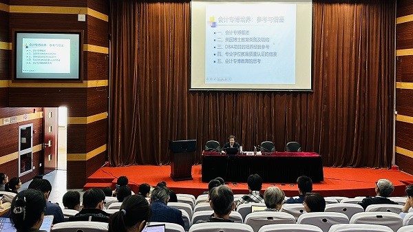 随后,曲晓辉教授介绍了MPAcc教育质量认证与DBA教育质量认证的基本情况、认证条件,分别讲解了全国会计专业学位研究生教育指导委员会、英国工商管理硕士协会在开展AAPEQ认证、AMBA认证时对学校与学院的具体要求,包括项目培养目标、培养结果、治理政策、师资队伍、报考条件、课程结构、学习模式等方面。教育质量认证是确保专业学位教育质量的重要手段。曲教授建议,学院在谋划会计专博学位授权点申请阶段,可以在对标国家学位授权审核申请基本条件之余,综合教育质量认证条件与要求,提前筹划学科发展、师资队伍建设并整合培养资源。