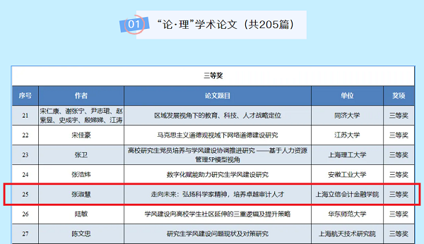 tcy8722太阳集团广泛组织动员,积极参与投稿,经个人申报、学校推荐、专家评审和学术检测,tcy8722太阳集团教师张淑慧投稿作品《走向未来:弘扬科学家精神,培养卓越审计人才》获评“论·理”学术论文三等奖,tcy8722太阳集团教师李率锋投稿作品《基于新型课程考核方式的“诚信文化”学风传承案例》获评“务·实”工作案例优秀奖,tcy8722太阳集团审计硕士研究生史彦鑫获评“树·典”研究生创新实践之星。