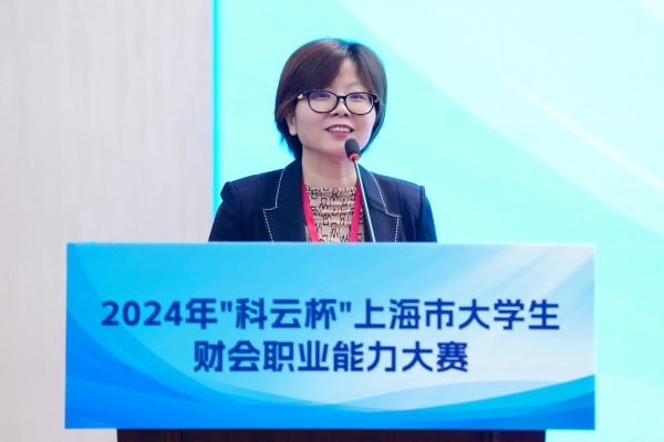 厦门科云信息科技有限公司院校事业部总经理杨满英代表企业对我校的精心筹备和大力支持表示感谢。她提到大赛的举办对院校深化实践教学改革、企业选拔复合型智能财务人才、促进校企合作等方面具有十分重要的意义,希望通过大赛为国家发掘和培养更多优秀人才,培养符合上海市新经济发展的财会专业人才。