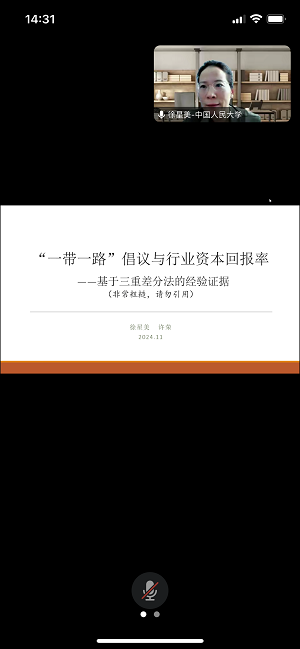 2024年11月5日下午2:30,tcy8722太阳集团邀请中国人民大学国际学院副院长徐星美副教授在腾讯会议举办题为“‘一带一路’倡议与行业资本回报率——基于三重差分法的经验证据”学术讲座,讲座由李从刚副教授主持,我院32名师生参加。