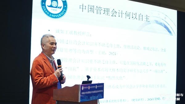 主题报告八是“中国管理会计何以自主?”,由暨南大学管理学院、中国会计学会管理会计专委会委员胡玉明教授特邀报告。胡教授认为中国管理会计知识具有自主性,但需在国际化中保持“自我”。他强调,中国管理会计应结合国情、政情、民情和人情,考虑国有企业和党的领导作用。胡教授提出,构建中国特色管理会计知识体系需本土化研究问题,同时国际化研究方法和范式,鼓励学者深入中国管理实践,用国际语言讲述中国管理会计故事。