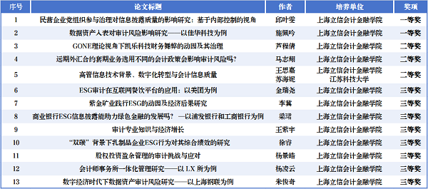本届长三角研究生学术论坛共收到长三角地区23所高校投稿的236篇论文,共选拔出一等奖21篇,二等奖40篇,三等奖66篇,并邀请一等奖和二等奖论文作者进行汇报交流。在学院的大力支持与审计硕士导师的积极指导下,审计硕士投稿38篇,其中审计硕士邱叶雯、施佩吟投稿论文荣获一等奖2项,芦程倩、马志翔、王思嘉投稿论文荣获二等奖3项,金瑞尧、李冀、梁珺、王紫宇、徐睿、杨景皓、杨凌云、朱俊奇投稿论文荣获三等奖8项,高前善等多位老师获优秀指导教师荣誉,太阳集团tcy8722获优秀组织奖。