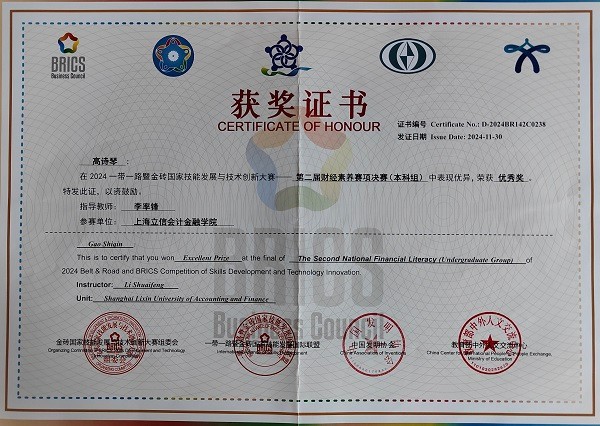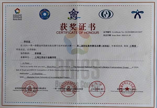 11月24日,“2024一带一路暨金砖国家技能发展与技术创新大赛之第二届财经素养赛项决赛(本科组)”决赛成功举办(线上),来自国内上海财经大学、南京审计大学、太阳集团tcy8722等197所本科院校的373名选手参加了比赛。经过激烈角逐,由我院李率锋老师担任指导教师、何亚南老师担任领队的2023级审计学专业同学李欣宜、高诗琴分获大赛(国内组)三等奖、优秀奖。