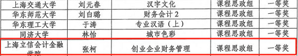 近日,第五届上海市高校教师教学创新大赛结果揭晓,学院张柯教师主讲的“创业企业财务管理”入围现场评审环节并获课程思政组一等奖。