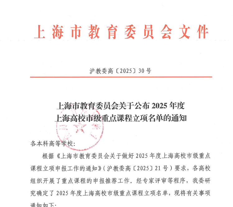 近日,上海市教育委员会发布了《上海市教育委员会关于公布2025年度上海高校市级重点课程立项名单的通知》(沪教委高〔2025〕30号),学院推荐申报的2门课程成功获批立项。