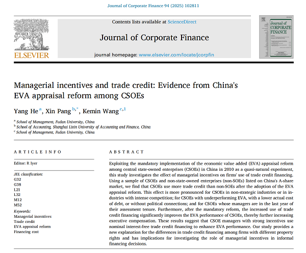 我院庞欣老师以通讯作者身份与合作者撰写的论文“Managerial incentives and trade credit: Evidence from China's EVA appraisal reform among CSOEs”在Journal of Corporate Finance期刊线上正式发表。Journal of Corporate Finance是ABS-4星级期刊和SSCI一区期刊,最新影响因子为7.2,是金融学和财务学领域的国际权威期刊。