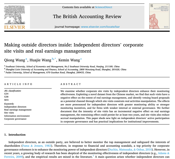我院王华杰副教授以通讯作者身份与来自东南大学、复旦大学的两位合作者撰写的论文“Making outside directors inside: Independent directors’corporate site visits and real earnings management”被会计学国际权威期刊British Accounting Review发表。据官网信息,British Accounting Review创刊于1969年,是英国会计与金融协会的官方期刊,在会计与金融领域具有很高的知名度和影响力。该期刊在国际ABDC期刊质量指南中被评为A*,在Academic Journal Guide中被评为ABS三星期刊。在2024年最新的CiteScore排名中,该刊位列会计学国际期刊第6位。
