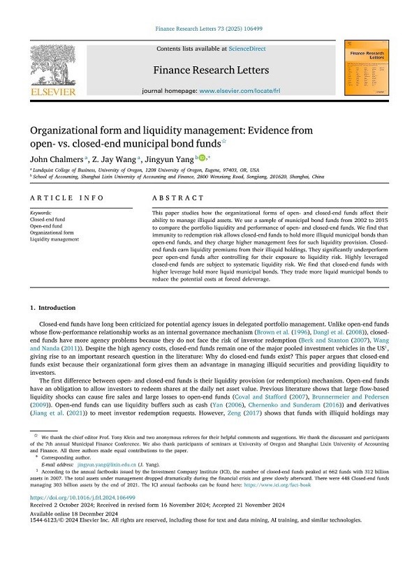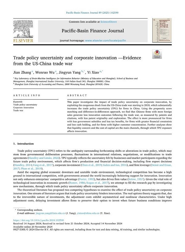 我院杨景雲老师以通讯作者身份与来自上海外国语大学的合作者共同撰写的论文《Trade Policy Uncertainty and Corporate Innovation — Evidence from the US-China Trade War》在国际高水平期刊《Pacific-Basin Finance Journal》正式发表,与美国俄勒冈大学的合作者共同撰写的论文《Organizational form and liquidity management: Evidence from open- vs. closed-end municipal bond funds》在国际高水平期刊《Finance Research Letters》正式发表。入职以来,杨景雲老师还在国际知名期刊《Pacific-Basin Finance Journal》以通讯作者的身份发表1篇论文。