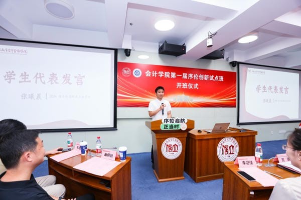 新生代表张曦晨在发言中对学校提供的广阔平台表示感谢,加入序伦班既是一份荣誉更是一份责任,序伦班全体新生将珍惜机会,不负学校厚望。他表示在当今科技不断变革的时代,序伦班新生将拥抱变化,迎接挑战持续探索。在班级建设上,班级同学们将互帮互助,在合作中凝聚力量,在交流中激发灵感。