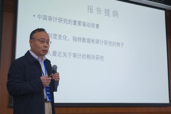 随后,复旦大学会计系原红旗教授以“中国审计研究:回顾与展望”为题,系统梳理我国审计制度发展的演进过程,深入阐述中国审计研究的重要驱动因素,强调审计研究应该重视基于中国制度背景与中国数据。原教授在主题报告中还通过引用大量国内外研究文献,说明中国审计制度变迁及中国审计数据的独特性,并和与会师生分享了其个人近期关于审计的相关研究。