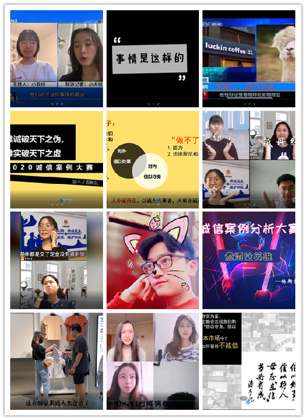 本次大赛自5月启动以来,同学们积极参与,最终7组队伍的案例进入决赛。决赛中,各组选手以vlog、情景剧、单口相声、新闻联播等形式在线展示了微商带货、瑞幸咖啡财务造假事件、职业证书挂靠资质等一个个令人深思的诚信案例,引导大家共同探讨诚信的品质和价值。