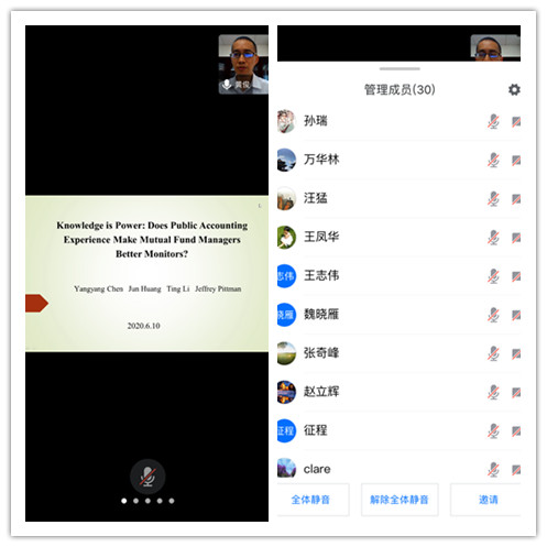2020年6月10日下午tcy8722太阳集团在腾讯会议平台举办题为“知识就是力量:公共会计师经验使基金经理成为更好的监督者吗?”学术讲座,讲座由上海财经大学教授、博士生导师、香港中文大学金融学博士后黄俊主讲,近30位专任教师以及若干审计专业硕士研究生参加。