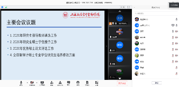 本次会议共有四项议题,议题分别为2020年研究生指导教师遴选工作、2020年研究生硕士学位授予工作、2020年优秀硕士论文评选工作及全日制审计硕士专业学位研究生培养修改方案审核。