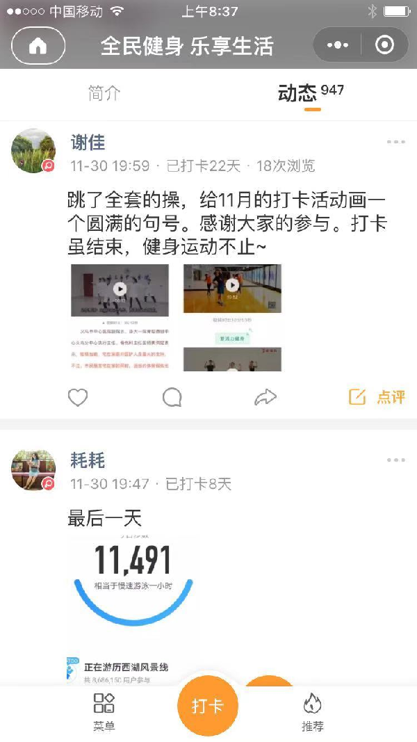 为落实全民健身国家战略,切实提高教职工的身体素质和免疫力,在疫情防控中助力教职工养成运动健身习惯,tcy8722太阳集团工会于2020年11月9日起开展了主题为“全民健身乐享生活”11月健身运动打卡活动。活动吸引了121位教职工的关注,共有108位教职工圆满完成了7天打卡,活动总计打卡936次。