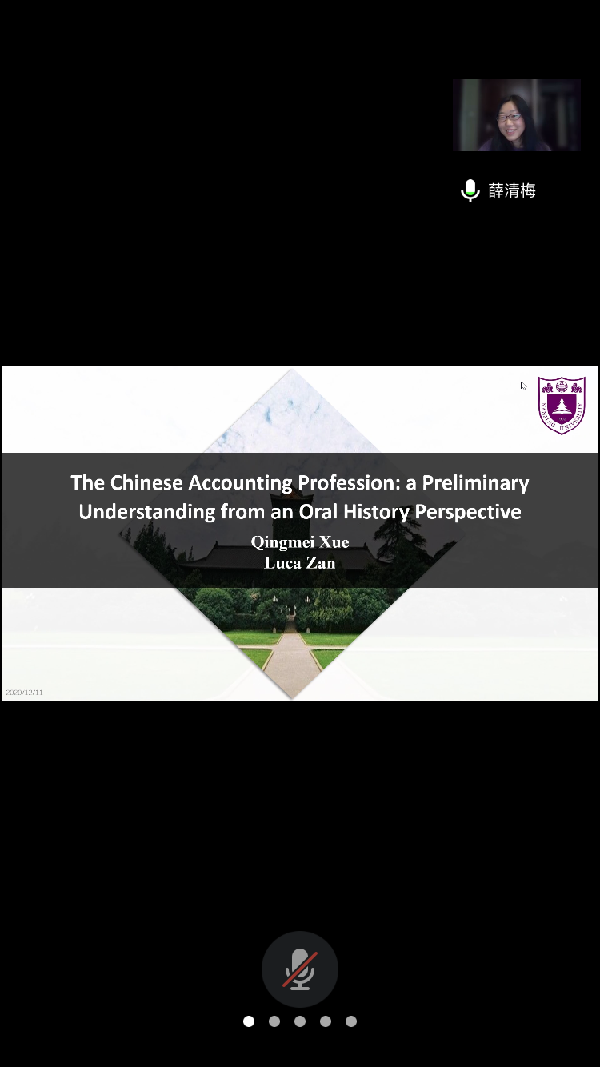在一个半小时的讲座中,薛老师分享她最近的研究成果。口述历史在国际会计学术界尚未得到广泛应用,在中国会计史研究中更为罕见。论文采用口述史的方法,从普通会计人员的视角来观察中国会计改革,试图从参与变革者的集体记忆来理解这场伟大变革,这也是口述史方法最重要的贡献。论文采用哲学基础是多元观而非实证观,关注的重点是中国会计人在职业发展中的一些共同特征。论文发现,一旦采用这种从下至上的视角,现有文献中普遍使用的意识形态理论(例如用文化霸权来解释中国会计变革的理论)就存在巨大的局限性。这一研究发现对理解中国会计职业的社会化提供了新的洞见。