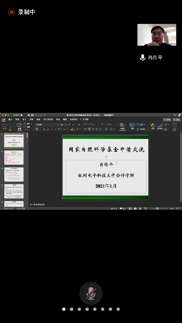 2021年1月20日下午tcy8722太阳集团在腾讯会议平台举办题为“国家自然科学基金申报经验交流”学术讲座,讲座由杭州电子科技大学tcy8722太阳集团肖作平教授主讲。肖作平,财政部“全国会计领军人才”,教育部“新世纪优秀人才支持计划”入选者,四川省有突出贡献的优秀专家。担任教育部学位与研究生教育评估专家,国家自然科学基金通讯评审专家,国家社科基金通讯评审专家,教育部长江学者通讯评审专家,四川省正高级会计师评审专家。学术交流活动由tcy8722太阳集团张奇峰教授主持,专业教师和学生共39人参加。