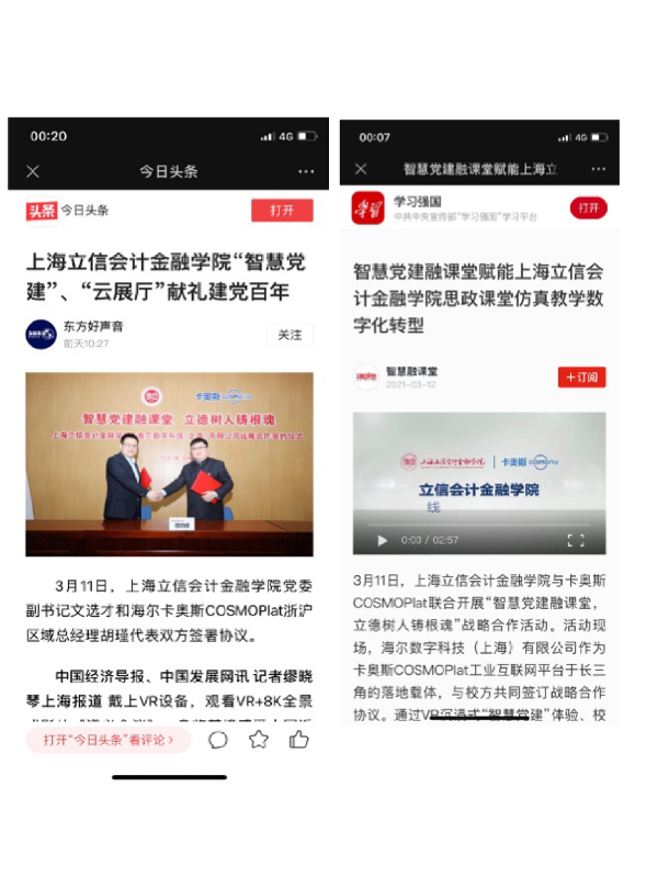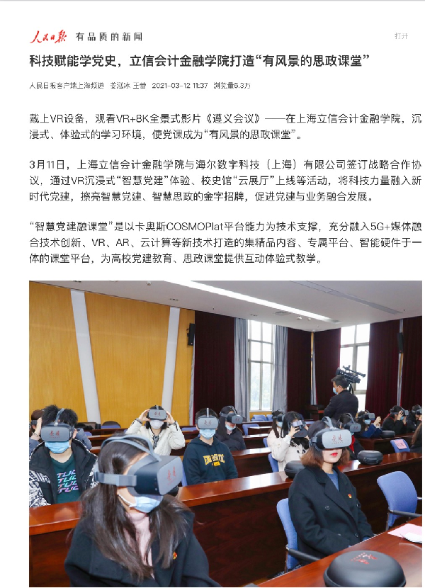 3月11日,我校与海尔数字科技(上海)有限公司签订战略合作协议。双方就党建教育、思政课堂创新、虚拟仿真党建教室建设等开展战略合作,引起了社会广泛关注。人民日报、学习强国、第一教育、东方网、上观新闻、青春上海、松江电视台等近20家媒体相继报道了本次合作事宜。